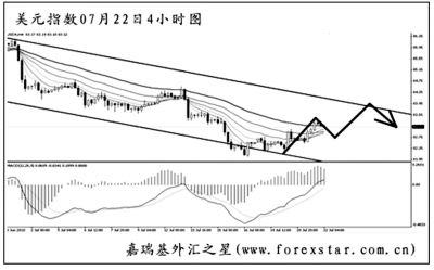 美國商務(wù)部上周公布的數(shù)據(jù)顯示,美國5月份國際商品和服務(wù)貿(mào)易逆差擴大4.8%,至422.7億美元,創(chuàng)下2008年11月以來的最大規(guī)模。而美國財政部公布的數(shù)據(jù)顯示,美國6月預(yù)算赤字為684.2億美元,為連續(xù)第21個月出現(xiàn)預(yù)算赤字,創(chuàng)延續(xù)時間之最。國內(nèi)消費方面,美國6月零售銷售連續(xù)第二個月下滑,且跌幅超出預(yù)期,表明消費支出呈現(xiàn)放緩跡象,并對受高失業(yè)困擾的經(jīng)濟形勢構(gòu)成打擊。美國6月消費者物價指數(shù)連續(xù)第三個月下滑,創(chuàng)2008年10-12月以來的最長下滑周期,主要是受到能源價格下跌的拖累。美國7月中旬消費者信心受挫,降至2009年3月以來的最低水平。市場分析師指出,由于美國經(jīng)濟數(shù)據(jù)全線疲軟,投資者信心遭受打擊,并且也引發(fā)了美國第二季度經(jīng)濟增長大幅放緩的憂慮,令美元全線潰敗。 歐洲方面,希臘、葡萄牙、西班牙均成功發(fā)行國債,暗示歐元區(qū)債市有望逐漸恢復(fù)常態(tài),國家主權(quán)債務(wù)違約的風(fēng)險正在下降。分析人士表示,盡管葡萄牙主權(quán)信用評級再遭穆迪調(diào)降,但是對歐元的沖擊已經(jīng)十分有限。隨著希臘、西班牙和葡萄牙等國國債的信用違約掉期合約價格開始走低,表明投資者對這些國家出現(xiàn)債務(wù)違約風(fēng)險的擔(dān)憂有所緩解。 從圖上看,美元指數(shù)在4小時圖通道下沿的位置遭遇支撐小幅反彈,圖中均線系統(tǒng)被穿破。原本美元有形成下跌中繼的欲望,但旗形上沿被發(fā)力升破,美元階段性的筑底基本宣告成功,后市將向通道上沿發(fā)起挑戰(zhàn)。短線美元指數(shù)還將有一波下調(diào),下周將以沖高回落的走勢為主。 下周需重點關(guān)注的財經(jīng)數(shù)據(jù)及事件包括:7月23日,德國公布7月IFO商業(yè)景氣指數(shù)(前值101.8)、英國公布第二季度GDP初值季率及年率(前值+0.3%、-0.2%);7月26日,日本公布6月商品進(jìn)、出口海關(guān)年率(前值33.4%、32.1%)、美國公布6月新屋銷售總數(shù)年化(前值30萬戶);7月27日,美國公布7月里奇蒙德聯(lián)儲制造業(yè)指數(shù)(前值+23);7月28日,澳大利亞公布第二季度消費者物價指數(shù)季率及年率(前值+0.9%、+2.9%)、美國公布6月耐用品訂單月率(前值-0.6%);7月29日,美聯(lián)儲公布褐皮書、新西蘭聯(lián)儲公布指標(biāo)利率、日本公布6月零售銷售年率(前值+2.8%)、德國公布7月官方季調(diào)后失業(yè)率(前值7.7%)。
