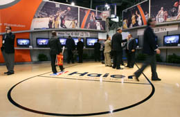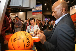 在海爾300多平方米的展位上,數臺超大屏幕高清電視上播放的NBA比賽畫面,動感十足,吸引了許多人的目光。等候海爾展區(qū)NBA巨星德雷克斯勒簽名的人排起了長隊。