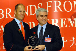 在美國拉斯維加斯舉行的國際消費(fèi)電子展上,由國際數(shù)據(jù)集團(tuán)、瑞德商業(yè)咨詢集團(tuán)、中國電子商會(huì)主辦,美國市場調(diào)查及預(yù)測公司協(xié)辦的中國十大消費(fèi)電子領(lǐng)先品牌評(píng)選活動(dòng)揭曉,海爾位居中國十大消費(fèi)電子領(lǐng)先品牌榜首,充分體現(xiàn)了海爾全球化戰(zhàn)略在國際上的影響力。圖為海爾美國貿(mào)易公司總經(jīng)理邁克先生(右)代表領(lǐng)獎(jiǎng)。吳明