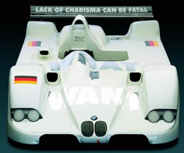 V12 LMR 藝術(shù)車。珍妮·霍爾澤的設(shè)計使用了她于先前作品“格言與 常在”中的六個短句,以鍍鉻字母和磷光涂料表現(xiàn)。珍妮·霍爾澤對代 表BMW的藍(lán)色與白色情有獨鐘,她讓這兩種顏色在24小時的馬拉松大賽 中盡現(xiàn)眼底——鍍鉻字母可在白天反映天空,而磷光涂料可在晚上散發(fā)出藍(lán)光。