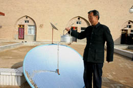 近年來(lái),在國(guó)家農(nóng)業(yè)部、發(fā)改委的大力支持下,甘肅省先后實(shí)施了“生態(tài)家園富民計(jì)劃”、“農(nóng)村小型公益設(shè)施補(bǔ)助資金農(nóng)村能源”和“農(nóng)村沼氣利用國(guó)債”等一系列新能源利用和生態(tài)保護(hù)綜合項(xiàng)目。截至目前,甘肅省農(nóng)民使用太陽(yáng)灶達(dá)超過(guò)50萬(wàn)臺(tái),居全國(guó)第一位;建成農(nóng)村戶用沼氣池12.3萬(wàn)個(gè),相當(dāng)于每年可減少砍伐林地30萬(wàn)畝,節(jié)約煤炭10萬(wàn)余噸。圖為甘肅省慶陽(yáng)市華池縣悅樂(lè)鎮(zhèn)新堡子村農(nóng)民龐平剛正在用太陽(yáng)能熱水器燒開水。 |