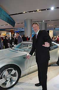 美國(guó)通用汽車(chē)公司新推出的雪佛蘭“Volt”概念車(chē),車(chē)上裝備有專(zhuān)為電池充電用的酒精和汽油混合燃料發(fā)動(dòng)機(jī)。經(jīng)濟(jì)參考報(bào)資料照片 |