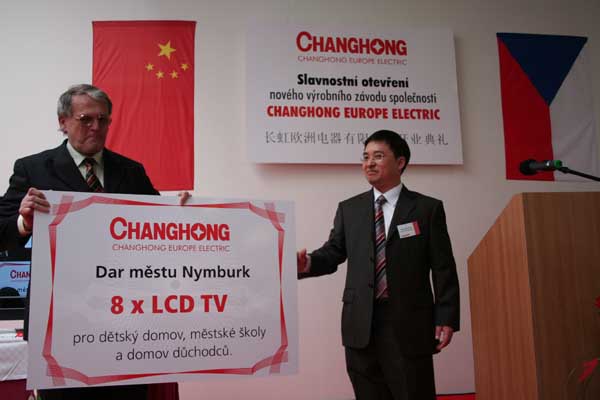 3月28日,長虹歐洲電器有限公司在捷克中部城市寧布爾克舉行開業(yè)儀式,并正式投入生產(chǎn)。這是長虹在歐洲的最大投資項(xiàng)目,也是中國家電企業(yè)在歐洲自主投資的第一個海外生產(chǎn)基地。長虹捷克生產(chǎn)基地一期項(xiàng)目投資逾1500萬美元,總產(chǎn)能100萬臺電視機(jī),主要生產(chǎn)平板電視和高清CRT電視產(chǎn)品。圖為長虹歐洲電器有限公司總經(jīng)理王文生向?qū)幉紶柨耸惺虚LLadislav Kutík贈送八臺電視機(jī),以用于當(dāng)?shù)氐膶W(xué)校和敬老院。