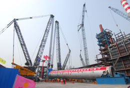 日前,在大連石化分公司新區(qū)工地上,中國(guó)石油第一建設(shè)公司將國(guó)內(nèi)最大加氫裂化反應(yīng)器成功吊裝就位。這個(gè)反應(yīng)器重1520噸、長(zhǎng)48.5米。圖為反應(yīng)器準(zhǔn)備吊裝。