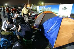 近日,杭州某樓盤出現(xiàn)多年不見的通宵排隊買房的景象。許多購房者住帳篷、睡草席,連排三天的隊。圖為5月27日,購房者在售樓處外排隊等待開盤。