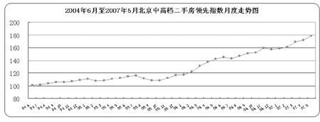 2007年5月,北京中高檔住宅成交領先指數(shù)為178點,均價為11583.2元/平方米,環(huán)比4月份成交價格上漲3.76%,仍然呈現(xiàn)穩(wěn)步上漲狀態(tài)。但從成交量上來看,5月份同4月份相比較,二手房成交量雖然仍在上漲,但交易活躍度不高,漲幅在5%左右。