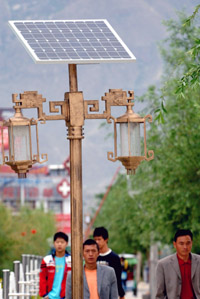 從上世紀(jì)80年代開始,西藏相繼實(shí)施“科學(xué)之光”“陽光計(jì)劃”“阿里光電計(jì)劃”等環(huán)保型能源推廣計(jì)劃。目前,西藏已建成10千瓦-100千瓦規(guī)模的縣級(jí)太陽能光電站7座。圖為拉薩宗角祿康公園里的太陽能路。