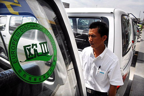 7月1日,在銀川市汽車大世界,一名汽車銷售人員在介紹一款符合歐洲3號排放標準的汽車。當日,相當于歐洲3號標準的國家機動車污染物排放標準第三階段限值(簡稱國Ⅲ標準)開始在全國范圍內(nèi)實施,這標志著我國汽車污染排放控制進入新階段。
