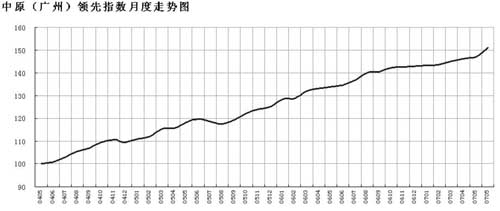 2007年6月,中原(廣州)領先指數(shù)為151.1點,比上月大幅增加4點,升幅為2.7%。市民普遍看好樓市前景,對樓價的預期也傾向于上升,成交價格漲幅明顯,成交量基本平穩(wěn),延續(xù)了3月以來的成交旺季。