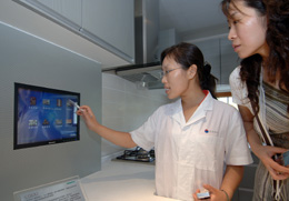 日前,海信集團(tuán)在青島海信研發(fā)中心正式發(fā)布命名為“DNet-home”的數(shù)字家庭系統(tǒng)標(biāo)準(zhǔn)第一版。在參照“DNet-home”標(biāo)準(zhǔn)建造的數(shù)字家庭體驗(yàn)館內(nèi),通過一部可隨身攜帶的平板電腦,業(yè)主就能在房屋內(nèi)的任何一個(gè)位置,對家中的電視、空調(diào)、電話、電冰箱、保安系統(tǒng)和智能監(jiān)控系統(tǒng)進(jìn)行設(shè)定和更改,同時(shí)通過移動電話、互聯(lián)網(wǎng)絡(luò)等設(shè)備還可對家中所有電子設(shè)備進(jìn)行遠(yuǎn)程遙控。 圖為研發(fā)人員在演示多媒體廚房控制系統(tǒng)。 |