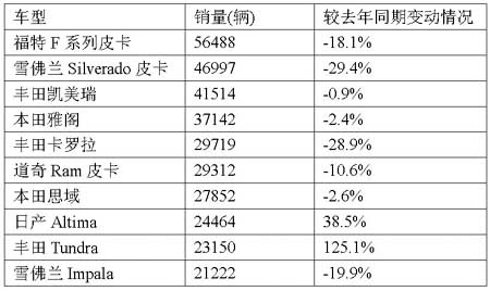 新華社紐約電 全球主要汽車制造商近日發(fā)布了各自7月份在美國市場的汽車銷售數(shù)據(jù)。以下是銷量排名前十位的汽車車型、銷量及與去年同期相比的變動情況。