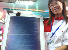 在第三屆中國吉林·東北亞投資貿(mào)易博覽會上,參會的中小企業(yè)展出的一些環(huán)保節(jié)能產(chǎn)品,受到與會客商和參觀者的關(guān)注和青睞。圖為一名工作人員在展示便攜式太陽能電池板。