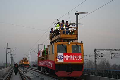 12月12日,我國首條時速達(dá)350公里的高速鐵路客運專線——京津城際鐵路第一條接觸網(wǎng)導(dǎo)線成功架設(shè),標(biāo)志著京津城際鐵路電氣化工程架線施工全面展開。京津城際鐵路電氣化工程引進(jìn)德國高速鐵路技術(shù),全長115公里,將于北京奧運會前投入使用。屆時京津通達(dá)只需半小時,且5分鐘發(fā)一次車。圖為承擔(dān)施工任務(wù)的中鐵電氣化局一公司的職工在架設(shè)接觸網(wǎng)導(dǎo)線!