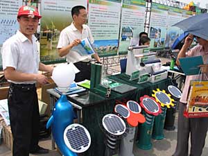 | 在濟南泉城廣場。太陽能光伏產(chǎn)品吸引了人們的目光。近年來,太陽能、風能方興未艾,將為改善我國能源結(jié)構(gòu)發(fā)揮更加重要的作用。本報記者