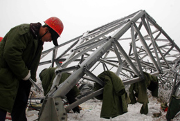 近日,嚴(yán)重的雪凝災(zāi)害造成貴州電網(wǎng)大面積損毀,全省近一半縣市相繼斷電。盡管山高坡陡、搶險艱苦,但貴州1.7萬多名電力職工發(fā)揚(yáng)“不怕吃苦、不畏嚴(yán)寒”的精神,晝夜奮戰(zhàn)在抗災(zāi)第一線。圖為南方電網(wǎng)公司貴陽供電局的搶險人員正在重建電塔。