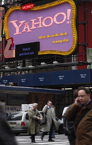 | 7日,行人從美國紐約時代廣場上的雅虎標(biāo)志牌前走過。雅虎當(dāng)天正式回應(yīng)微軟方面的“最后通牒”,稱其提供的446億美元收購價過低,因而拒絕此報價。新華社/路透 | 雅虎公司7日正式對微軟公司發(fā)出的“最后通牒”予以回應(yīng),表示如果微軟能夠出更高的價格,將會同意收購;否則,堅決不接受“低于雅虎價值”的報價。同時,雅虎還認(rèn)為,微軟的惡意收購不可能成功,稱這有悖于微軟此前表達(dá)的“友好交易”的原則。一時間,這樁互聯(lián)網(wǎng)業(yè)界廣為關(guān)注的并購案再次陷入僵局。