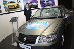 在2008北京國際汽車展覽會上,吉利公司展出一輛采用甲醇燃料的轎車。本報記者:吳凱翔