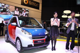 在2008北京國際汽車展覽會上,工作人員介紹一輛奔馳smart微型車,這款車采用可回收的塑料車身面板,使整車重量大大降低,從而大大降低了油耗。本報記者:吳凱翔