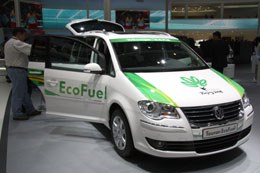 在2008北京國際汽車展覽會上,大眾公司展出一輛使用環(huán)保燃料的途安EcoFuel車型。本報記者:吳凱翔