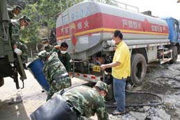 四川汶川大地震發(fā)生后,由于肩負成品油入川主動脈的蘭成渝管線緊急停輸,寶成鐵路運輸中斷,四川成品油庫庫存告急。特別是隨著大批救援車隊的源源不斷進入,成品油供應異常吃緊。 “面對突如其來的地震災情,中國石油緊急召開會議,就抗震救災做出全面部署!敝袊图瘓F公司宣傳處的李生儒告訴記者,“集團公司黨組書記、總經理蔣潔敏任抗震救災領導小組組長,副總經理王宜林率隊趕赴災區(qū)一線。隨后銷售公司副總經理田景惠也趕赴災區(qū),一場油品保供攻堅戰(zhàn)由此展! 中國石化集團信息處處長章治國說,地震發(fā)生后,正在大連參加中央企業(yè)負責人培訓班的中國石化集團黨組書記、總經理蘇樹林立即趕回北京,主持集團公司黨組會研究部署抗震救災工作;中國石化先后派出4名黨組領導趕赴災區(qū)現(xiàn)場組織抗震救災。 據介紹,兩大石油公司幾乎不約而同地啟動了應急預案,采取非常手段,加強災區(qū)成品油供應。 中國石油集團公司迅速做出向災區(qū)緊急調撥增供10萬噸成品油的決定。13日,其華東銷售公司迅速通過長江水陸向四川搶運增供的2萬噸油品;西北銷售公司也通過公路向四川綿陽、德陽和廣元重災區(qū)送油。14日凌晨,滿載東北銷售公司7500噸成品油的專列,分別從大連、遼陽、錦州起運,發(fā)往四川災區(qū)……到16日下午2時,四川地區(qū)的成品油庫存開始超過20萬噸,恢復正常水平。 而中國石化從5月12日到21日之間,累計向災區(qū)調運成品油7.2萬噸,保證了部隊、鐵路機車、航空用油和抗震救災車輛用油。
