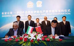 5月30日,長安汽車與伊朗PIDF集團(tuán)正式在重慶長都假日酒店簽署雙方合作在伊朗生產(chǎn)長安奔奔的協(xié)議。該協(xié)議內(nèi)容包括技術(shù)轉(zhuǎn)讓及零部件供應(yīng)等一攬子合同,初期生產(chǎn)線建設(shè)規(guī)模為5萬輛,并最終達(dá)到25萬輛年產(chǎn)量的規(guī)模。 按照雙方達(dá)成的協(xié)議,今年年底,長安將全部完成在伊朗建線的設(shè)備準(zhǔn)備,從明年上半年開始正式投產(chǎn)。