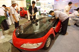 6月27日,一輛外形酷似跑車(chē)的電動(dòng)車(chē)吸引了觀(guān)眾駐足觀(guān)看。當(dāng)日,為期3天的2008第四屆中國(guó)國(guó)際電動(dòng)車(chē)暨休閑運(yùn)動(dòng)車(chē)展在北京中國(guó)國(guó)際展覽中心開(kāi)幕。 |