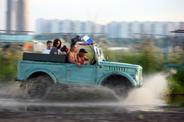 7月12日,在俄羅斯首都莫斯科前圖希諾機(jī)場(chǎng)(Airport Tushino),人們開(kāi)著吉普車從水中駛過(guò)。當(dāng)日,2008汽車風(fēng)情展(Autoexotic 2008)莫斯科站正式對(duì)公眾開(kāi)放,汽車愛(ài)好者們開(kāi)著自己的愛(ài)車聚集在這里,交流車技和改裝、保養(yǎng)車輛的知識(shí),分享對(duì)汽車和駕駛的熱愛(ài)之情,觀看表演品嘗美食,享受夏日時(shí)光。