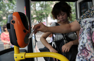 交通一卡通、北京交通網(wǎng)實(shí)時(shí)路況查詢(xún)、96166交通服務(wù)熱線、動(dòng)態(tài)交通導(dǎo)航、城市道路巡查管理系統(tǒng)等智能化的交通體系在北京交通系統(tǒng)中廣泛運(yùn)用,為服務(wù)奧運(yùn)、方便市民出行、緩解擁堵提供了有效的科技支持,提高了交通服務(wù)質(zhì)量。圖為乘客正在刷一卡通乘公交車(chē)。