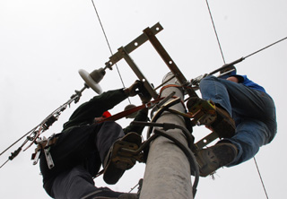 長期以來,青海牧區(qū)的藏族牧民只能依靠自家的太陽能光伏板發(fā)電,電流量小、電壓不穩(wěn),大多數(shù)家用電器無法使用。國家電網(wǎng)公司在青海省啟動“戶戶通電”工程后,大電網(wǎng)不斷向牧區(qū)延伸入戶,為10多萬藏族牧民送上了放心電力。圖為青海省興海供電公司施工人員在為莫多村架設(shè)“戶戶通電”線路。