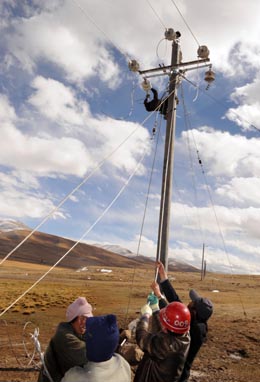 西藏電力有限公司“戶戶通”工程工作人員在當雄地震災區(qū)克服種種困難,加緊施工進度,爭取在最短的時間內(nèi)為震中災區(qū)羊易村的受災群眾送上電。圖為西藏電力有限公司的工作人員在當雄地震震中羊易村架設電線。