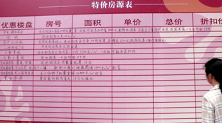據(jù)南京房地產(chǎn)家居網(wǎng)最近的一項(xiàng)調(diào)查顯示,在南京市政府出臺(tái)《關(guān)于保持房地產(chǎn)市場(chǎng)穩(wěn)定健康發(fā)展的意見》后,67.5%的被調(diào)查者認(rèn)為房?jī)r(jià)還會(huì)降,持觀望態(tài)度者占多數(shù)。圖為一位南京市民在房展會(huì)上觀看特價(jià)房源表。