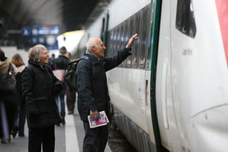 盡管在瑞士蘇黎世州每千人擁有私人汽車超過800輛,但是仍然有60%的居民在高峰時段選擇公共交通工具出行。由49家公交運(yùn)營公司組成的蘇黎世公共交通網(wǎng)絡(luò)提供鐵路、公共汽車、有軌電車、無軌電車、湖船等服務(wù),其中軌道交通通車?yán)锍碳s為600公里。乘客一票在手可以在所購車票規(guī)定時間內(nèi)不限次數(shù)乘坐任意公共交通工具。圖為在蘇黎世的中央車站,兩位老人與親友道別。