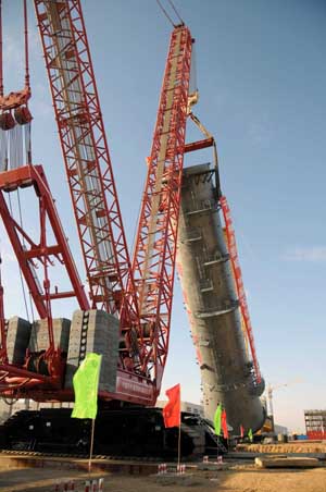 神華寧煤集團(tuán)烯烴公司是世界第一個以煤炭為原料生產(chǎn)聚丙烯的大型化工項(xiàng)目,位于寧夏寧東能源化工基地,公司采用的MTP(甲醇制丙烯)裝置是目前裝置能力最大、最先進(jìn)的固定床反應(yīng)器裝置,正在吊裝的C3(碳三)分離塔是MTP技術(shù)核心裝置,直徑8米,總高100.3米,重2024噸。