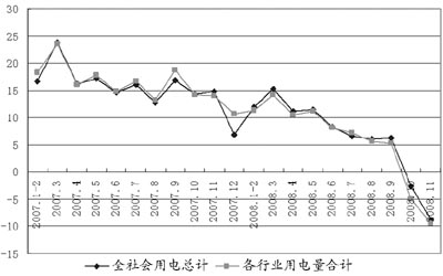 來自電力部門的統(tǒng)計數(shù)據(jù)顯示,11月份全國用電量同比增長-8.33%,這是在10月份用電量增長-2.18%的基礎上出現(xiàn)大幅下滑。有專家預計,12月份用電量還會繼續(xù)下降。 電力向來被視為國民經(jīng)濟的“晴雨表”,透過用電量的增長可以準確把握產(chǎn)業(yè)、行業(yè)的發(fā)展狀況及宏觀經(jīng)濟的走勢。 由國網(wǎng)北京經(jīng)濟技術研究院副院長胡兆光博士繪制的一份“2007年以來各月我國全國及各行業(yè)用電量增長速度”圖表(圖1)顯示:全國月度用電量增長率在2007年3月曾高達23.88%,全行業(yè)(一、二、三產(chǎn))月度用電量增長率也達到23.48%。此后便呈起伏式下滑,全國用電量10月份同比增長-2.18%,11月份同比增長-8.33%。 “首先,受全球金融危機影響,我國部分出口行業(yè)的用電量增速下滑最為明顯。”胡兆光說,“特別是嚴重依賴出口的紡織業(yè)等正在步入衰退期! 記者從他繪制的“2007年以來各月部分出口行業(yè)用電量增長速度”圖表(圖2)中看到,紡織業(yè)的用電增速在2007年基本維持在10%左右,從今年3月份起開始下滑,7月份為-0.4%,8月份為-0.7%,9月份為-0.79%,10月份為-9.49%,11月份達到-12.34%,已經(jīng)連續(xù)5個月為負增長。服裝鞋帽及其制品業(yè)和木材加工家具制造業(yè)的用電量也在10月份分別出現(xiàn)-11.17%和-2.98%的負增長,11月份分別為-7.8%和-14.6%的負增長。 胡兆光說:“國際金融危機已經(jīng)直接影響到我國部分行業(yè)的生產(chǎn)經(jīng)營。盡管我國政府在今年下半年陸續(xù)調(diào)整出口退稅政策,但從目前看很難扭轉(zhuǎn)這種下滑的局面。” “其次,受國內(nèi)市場影響較大的黑色、有色行業(yè)的用電量也呈現(xiàn)大幅度下降!焙坠飧嬖V記者,黑色、有色行業(yè)的用電量增長今年10月份分別為-16%及-8.9%,到11月份更分別降至-24.5%及-14.5%。(圖3)他說:“黑色、有色行業(yè)的發(fā)展與房地產(chǎn)有直接的關聯(lián)。房地產(chǎn)業(yè)的不景氣導致對鋼材、鋁等產(chǎn)品的需求不旺。”此外,今年10月份用電負增長的行業(yè)還有:印刷、文體用品制造業(yè)用電增速分別為-6.5%和-10.5%;化工業(yè)為-8.57%,其中氯堿為-28.9%,電石為-27.7%;醫(yī)藥制造、化纖制造、橡膠塑料制造業(yè)也是負增長。11月份用電負增長的行業(yè)已擴大到采礦業(yè)為-12.5%,及占全國當月用電量的一半的制造業(yè)中的20個行業(yè)均為負增長。但建筑、交通、信息服務、住宿餐飲、服務及機關等行業(yè)用電增速還是正的。 |