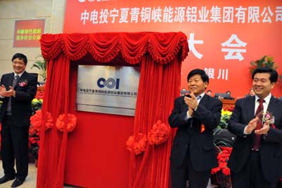 12月26日,注冊資本金50億元中電投寧夏青銅峽能源鋁業(yè)集團有限公司正式成立。寧夏政府主席王正偉(右一)與中國電力投資集團總經理陸啟洲(左一)等領導一起為中電投寧夏青銅峽能源鋁業(yè)集團有限公司揭牌。本報記者:武勇