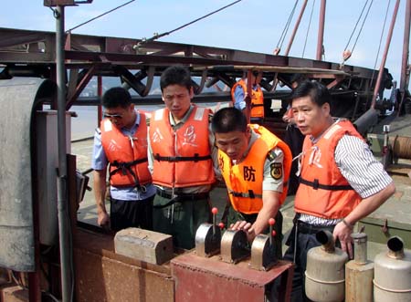 福州市邊防支隊官兵正在一艘采砂船上檢查。 新華社記者:康淼