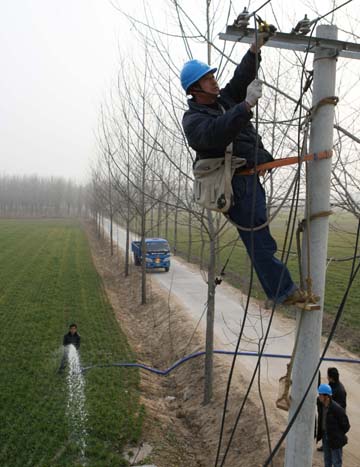 面對(duì)當(dāng)前嚴(yán)重的旱情,安徽淮北電力部門積極行動(dòng),組織抗旱保電突擊隊(duì),深入鄉(xiāng)鎮(zhèn)農(nóng)田灌溉現(xiàn)場,增設(shè)線路、變壓器等配電設(shè)備,并對(duì)電灌站進(jìn)行24小時(shí)值班巡查,全力以赴保障麥田抗旱灌溉用電。圖為淮北供電公司員工在淮北市烈山區(qū)古饒鎮(zhèn)增設(shè)抗旱用電線路,方便農(nóng)民使用抽水機(jī)抽水澆麥。