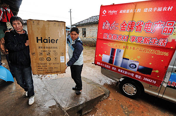 3月4日,福建省浦城縣家電下鄉(xiāng)服務(wù)隊(duì)在仙陽(yáng)鎮(zhèn)太平村為農(nóng)戶送貨。 當(dāng)日,惠及農(nóng)民的“家電下鄉(xiāng)”在福建閩北山區(qū)浦城縣全面啟動(dòng),價(jià)格實(shí)惠的家電產(chǎn)品和熱情周到的服務(wù)深受山區(qū)農(nóng)民的歡迎。 | |