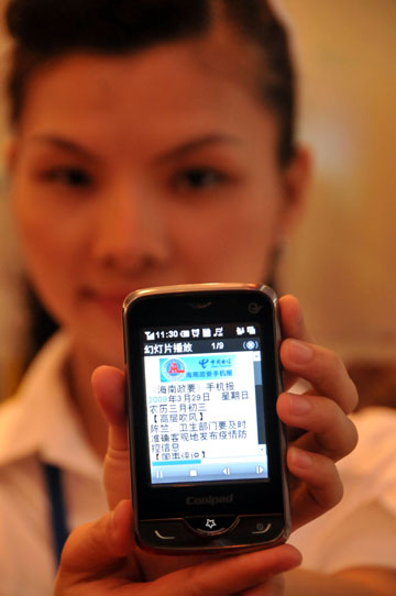 日前,中國電信海南公司3G試商用發(fā)布會在海南省?、三亞、瓊海、儋州四市同時進(jìn)行,標(biāo)志著海南3G業(yè)務(wù)正式啟動,海南首批近百名3G用戶誕生。 自2009年1月7日國家正式發(fā)放3G牌照以來,海南電信經(jīng)過近三個月的努力使海南的3G網(wǎng)絡(luò)基本建成并具備了試商用條件。到目前為止,海南電信3G網(wǎng)絡(luò)共投入建設(shè)資金近六億元,無線寬帶網(wǎng)絡(luò)已覆蓋到全省18個市縣的主要城區(qū),東線高速已全程覆蓋,預(yù)計到今年5月中旬,3G網(wǎng)絡(luò)將覆蓋海南省所有鄉(xiāng)鎮(zhèn)。圖為工作人員展示手機(jī)3G業(yè)務(wù)中的“海南政要手機(jī)報”。 |