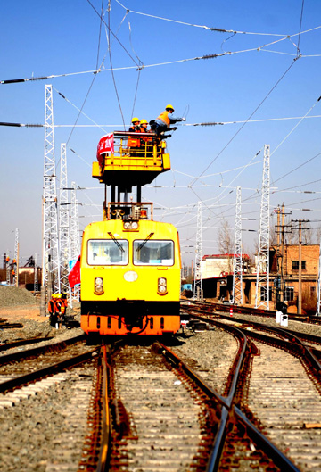 國(guó)家重點(diǎn)工程、內(nèi)蒙古自治區(qū)境內(nèi)首條電氣化鐵路——大同至包頭(簡(jiǎn)稱大包線)鐵路電氣化改造工程目前進(jìn)入最后攻堅(jiān)階段。大包線建成開通后,對(duì)緩解我國(guó)北部鐵路煤炭運(yùn)能不足的緊張狀況,加速內(nèi)蒙古西部地區(qū)煤炭基地的開發(fā)具有重要意義。圖為中鐵電氣化局一公司的工人正在呼和浩特西貨站架設(shè)電纜。