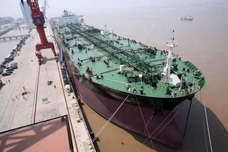 4月15日,由浙江舟山金海灣船業(yè)有限公司建造的11萬噸級油輪“海灣號”正式交付船東——挪威金色海洋航運公司。這標志著浙江邁入了制造10萬噸以上級船舶大省的行列。售價高達4.35億元人民幣的“海灣號”長243米、寬42米、載重吃水深度22米、最大航速15節(jié)、排水量11萬噸,總體性能達到國際先進水平。圖為“海灣號”油輪準備首航!