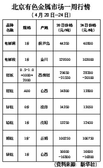 北京有色金屬市場(chǎng)一周行情[04.20-04.24]