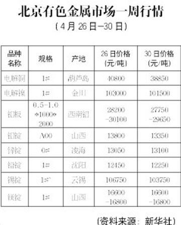 北京有色金屬市場一周行情[04.26-04.30]
