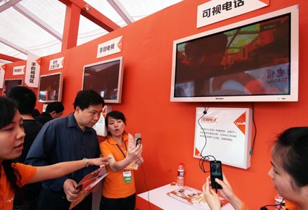 16日,移動(dòng)、聯(lián)通、電信三大通訊運(yùn)營商在武漢國際會(huì)展中心開賣3G手機(jī),展示最新的3G通訊技術(shù)與終端設(shè)備,引起市民的極大興趣。上圖為一名女孩在現(xiàn)場體驗(yàn)無線上網(wǎng)。下圖為工作人員向市民演示3G手機(jī)可視電話功能。新華社發(fā)(王振武