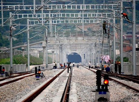 溫福鐵路北起浙江省溫州南站,南至福建省福州市,全長約300公里,是一條電氣化鐵路客運專線。圖為工人在溫福鐵路福建霞浦段緊張施工。