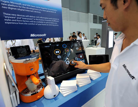 在日前舉行的臺北國際電腦展上,工作人員展示微軟公司開發(fā)的一款新產品,用戶可通過電話或電腦控制咖啡機,自動沖泡咖啡。