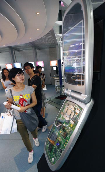 觀眾正在參觀手機的內(nèi)部芯片設(shè)計模型。