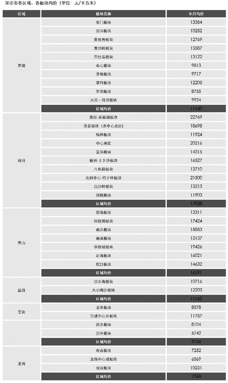 深圳市各區(qū)域、各板塊均價(jià)(單位:元/平方米)