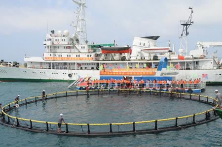 我國(guó)向南海投放700多萬尾海洋生物種苗。6月29日,由農(nóng)業(yè)部漁業(yè)局主辦的“2009年北部灣海洋生物資源增殖放流活動(dòng)”在三亞灣鳳凰島上舉行。這是工作人員正在放流圈養(yǎng)的鯨鯊。漁業(yè)增殖放流是把原產(chǎn)區(qū)優(yōu)良經(jīng)濟(jì)魚類、蝦類、貝類等苗種,投放于適當(dāng)?shù)暮S颍瑥亩3趾Q笊镔Y源生態(tài)平衡。