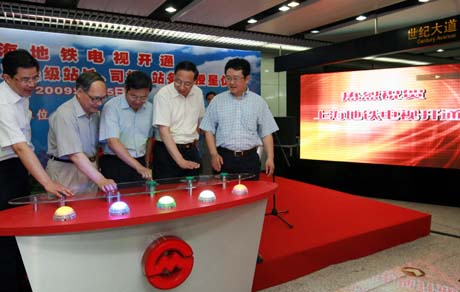 7月5日,上海地鐵電視經(jīng)過近半年的試運營后正式開通,成為國內(nèi)首家進行直播的地鐵電視。圖為有關(guān)各方在上海地鐵浦東世紀大道站啟動上海地鐵直播電視。